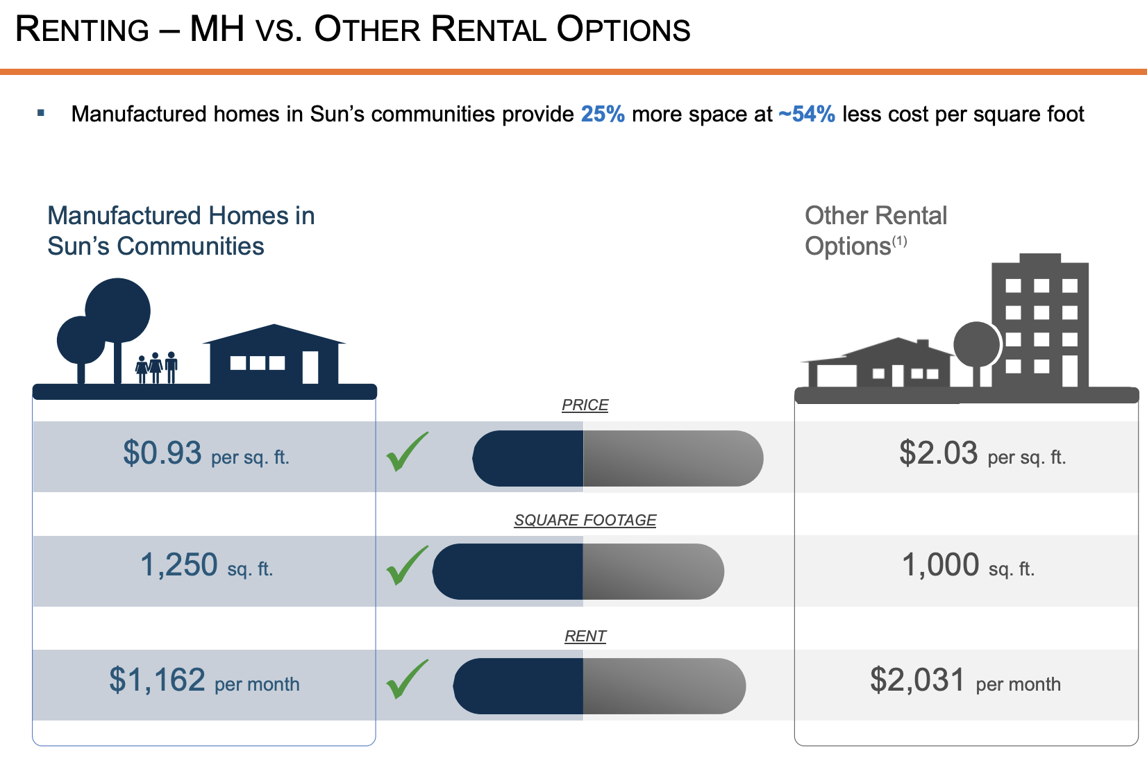 One of the biggest benefits the company brings to the table is exposure to affordable housing. Essentially, MH alternatives in SUI communities provide 25% more space at 54% less cost per square foot, according to the company.