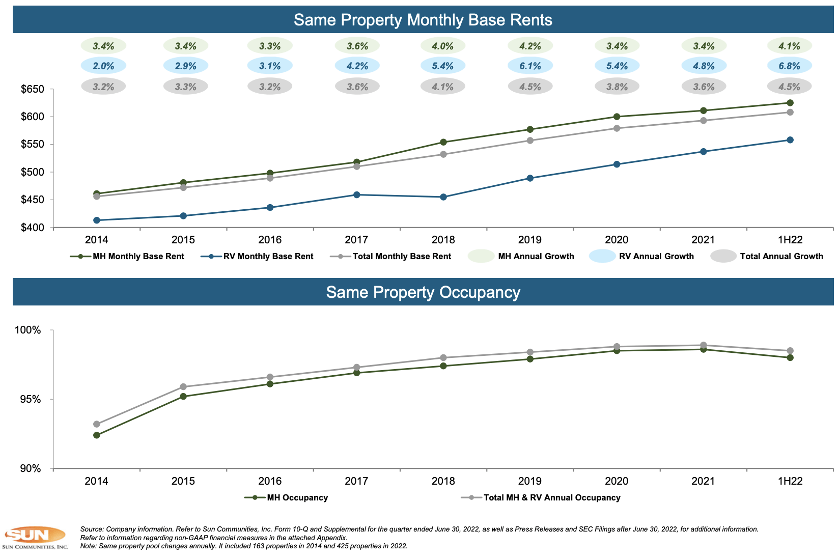 That said, internal growth is also provided by available sites on existing properties. Since 2020, SUI has invested roughly $200 million in its own properties, targeting a 10-14% internal rate of return. In 2020 and beyond, more than 10,800 sites are available for expansion.