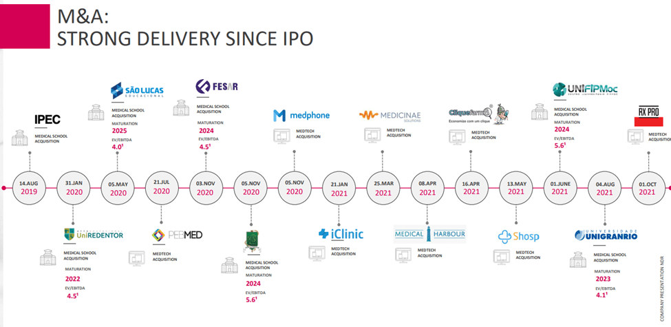 Another key positive from this acquisition is that it allows Afya to exceed its prior guidance of acquiring >200 medical seats/year. Over the mid to long term, the scale benefit from adding these seats is significant as well – Afya’s medical school scale now stands at ~3,100 seats, a ~12% increase relative to pre-acquisition levels, making it uniquely placed within the overall medical ecosystem. Plus, in the current environment of rising interest rates and increased investor focus on earnings, the greater exposure to cash flow generative medical undergraduate programs is a strategic positive. Given the acquired assets have a 40% mix of undergraduate students in medical programs (vs. <30% for Afya), the guidance for a long-term EBITDA margin of ~55% makes sense, in my view.