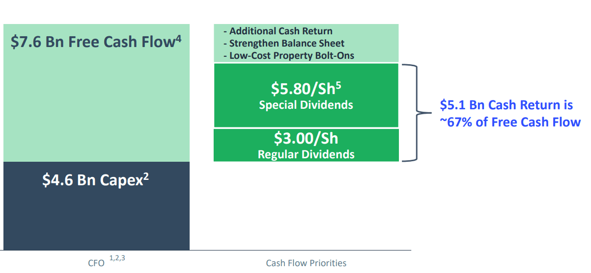 Put simply, EOG’s base dividend annualized is now at $3.30. Hence, if we could vaguely count on at least $5 of special dividends in 2023, this would imply that its combined dividend could reach $8.30 per share, or close to 6.4%.
