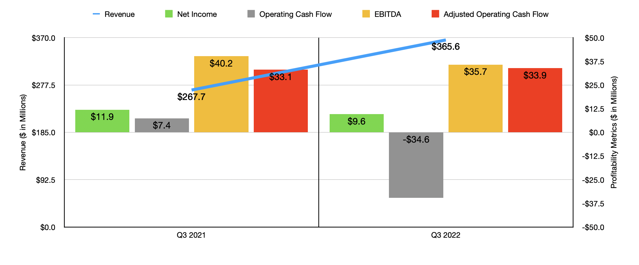 This downward revision came at a time when overall financial results for the company became a bit mixed. For the third quarter of its 2022 fiscal year, for instance, the company reported revenue of $365.6 million. That’s 36.6% higher than the $267.7 million reported the same time last year. Although revenue rose nicely in response to strong demand across most of the company’s product categories, profit figures came in a bit lower. Net income fell from $11.9 million last year to $9.6 million this year. Some of this pain was in response to the company’s gross margin falling from 36% to 35%, driven by an increase in product costs outpacing the price increases management had put in place. Even more painful, though, was the 63.5% increase in selling, general, and administrative expenses that the company experienced. The largest portion of this involved higher personnel and related costs. Increased advertising and marketing expenses, increased facilities costs, a rise in administrative expenses, and other factors, all negatively affected the enterprise. Naturally, other profitability metrics for the company suffered as a result. Operating cash flow went from $7.4 million to negative $34.6 million. But if we adjust for changes in working capital, it would have inched up from $33.1 million to $33.9 million. Unfortunately, though, this was the only positive for the company from a profitability perspective. Even EBITDA for the company worsened year over year, dropping from $40.2 million to $35.7 million.