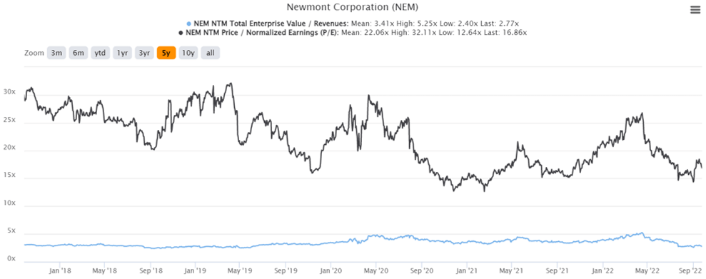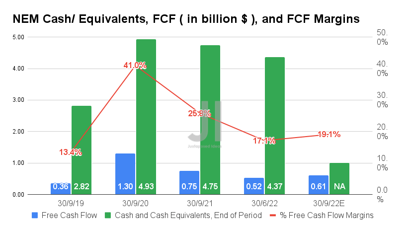 Therefore, it is no wonder that NEM is expected to report a lower Free Cash Flow (FCF) generation of $0.61B and an FCF margin of 19.1% in FQ3’22, indicating a remarkable increase of 17.3% and 2 percentage points QoQ, respectively. Otherwise, a minimal decline of -18.66% and -6.7 percentage points YoY, respectively.