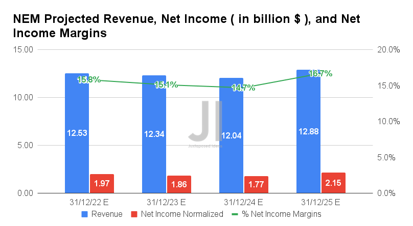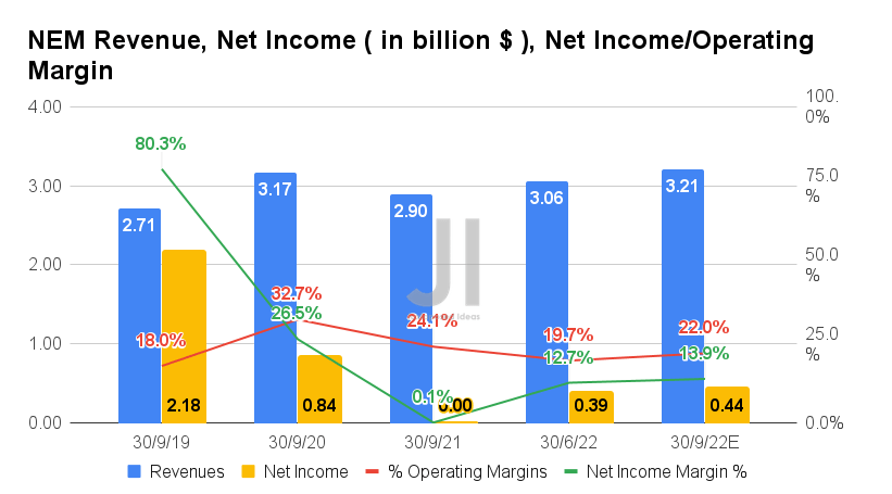 Nonetheless, NEM is expected to report improved profitability as well, with net incomes of $0.44B and net income margins of 13.9% for the next quarter. It will indicate a decent increase of 2.56% and 1.2 percentage points QoQ, respectively, otherwise, an impressive YoY growth from FQ3’21 levels of $3M net incomes and 0.1% net income margins.