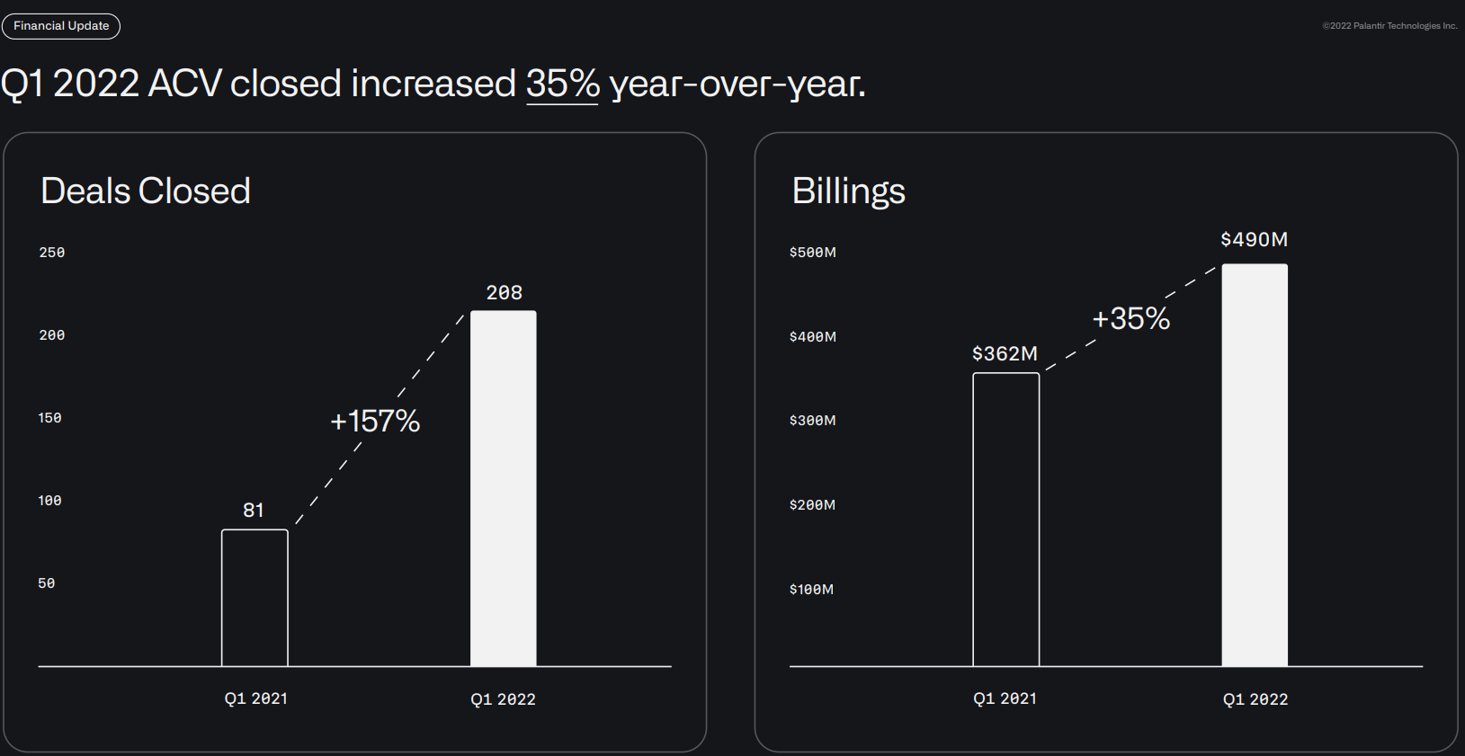 Deals being closed are also a concern, especially since PLTR is spending more on sales and marketing. In Q1 2022, PLTR closed 208 deals YoY compared to 81 deals YoY in Q1 of 2021. YoY billings increased 35% from $362 million in Q1 of 2021 to $490 million in Q1 2022.