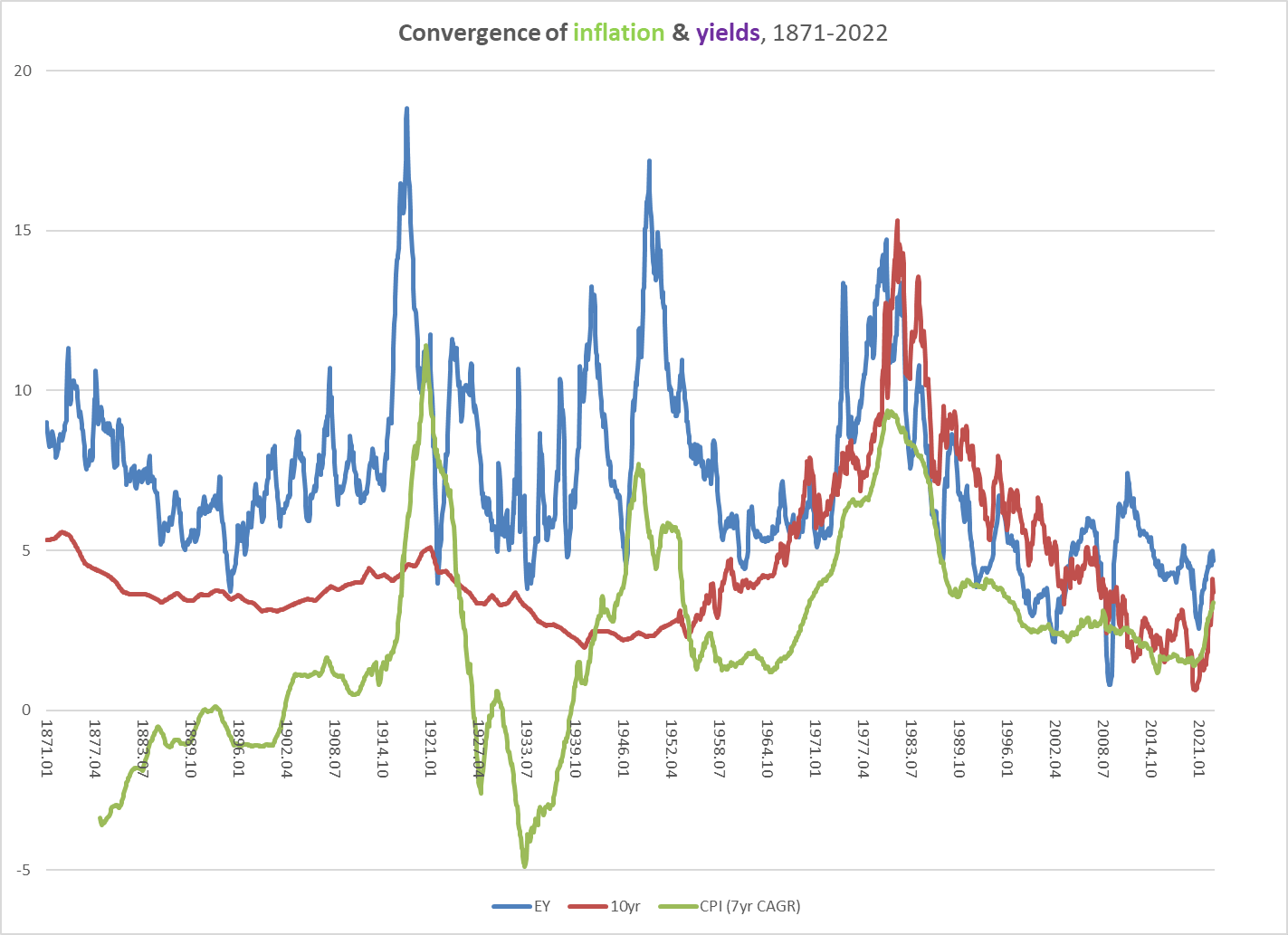 If inflation were to stay at its current level for the next year (about 7.5%), which is also unlikely, then that would leave the long-term rate of inflation at 4% per annum (one percentage point below the earnings yield), which is higher than average but easily within historical range.