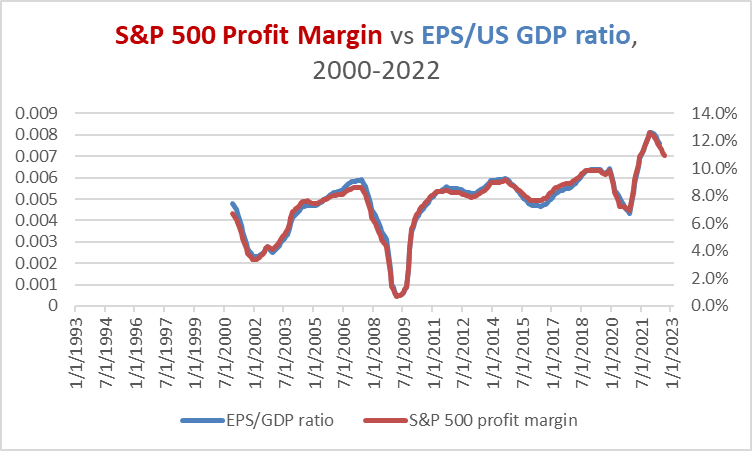 Using US GDP data as a proxy presents some problems. S&P 500 revenue is more exposed to the goods sectors and the global economy than is the US’s services-oriented economy. Even so, over the long term, the sales/GDP figure seems to stay within the 50%-65% range.