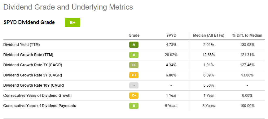 SPYD has an above-average dividend yield, a reasonable dividend growth track-record, and a steadily rising yield on cost. Although the fund does not excel in any dividend metric, all seem reasonably good, and all benefit the fund and its investors.