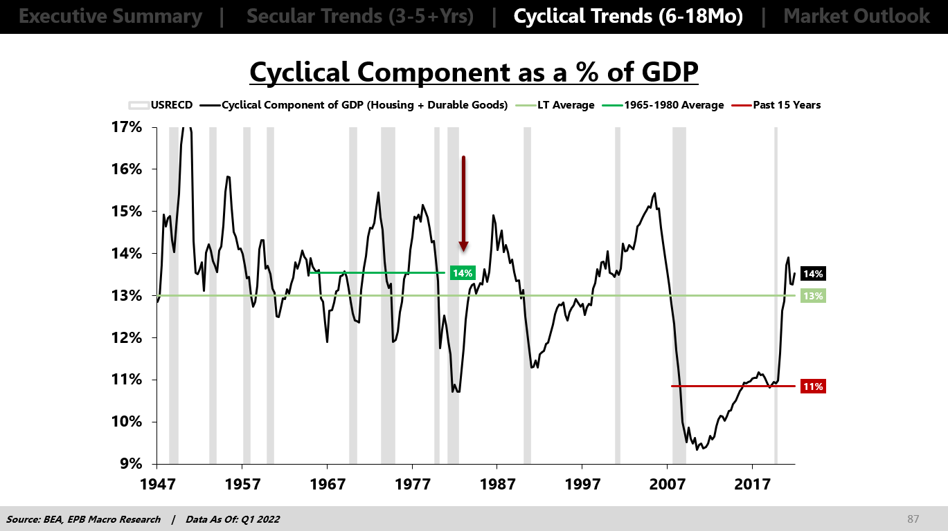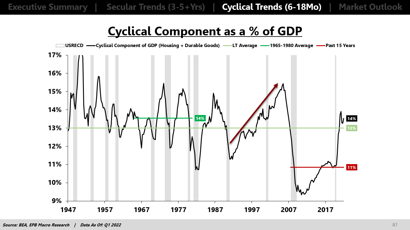 Over the last 70 years, in the United States, housing and durable goods comprised about 13% of total GDP on average. These two sectors are highly cyclical or boom-bust, so during an economic expansion the percentage rises, and during a recession or a bust, the percentage falls.