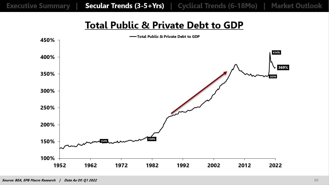Importantly, the U.S. economy sustained above-average levels of housing and goods consumption with virtually no increase in debt. Total debt to GDP increased less than ten percentage points in those 15 years despite a boom in cyclical growth.