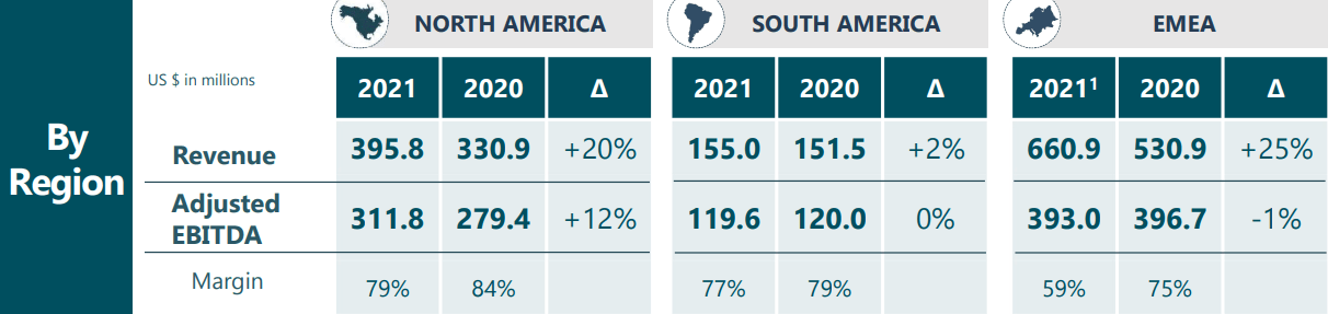 In 2021, AY revenues grew 20% YoY, while Adj EBITDA showed 12% growth. While YoY EBITDA margin decline is noticeable, it is essential to note that the company invested ~$480 million in 2021 to grow its asset base. The majority of these investments were made to fortify and expand operations in North America.