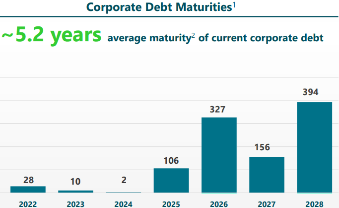 90% of AY’s long-term debt is fixed-rate or hedged, meaning the company will experience negligible impact from Fed rate hikes. Moreover, ~52% of AY’s Cash Available For Distribution (‘CAFD’) is indexed in some manner to provide a hedge against inflation. It gets better; AY has also utilized the low-interest rate climate to its advantage by lowering its net interest rate to 5.2% (down from 6.9% in 2020). AY’s average maturity of corporate debt is ~5.2 years, indicating the company’s tremendous flexibility with its cash flow for the near term.
