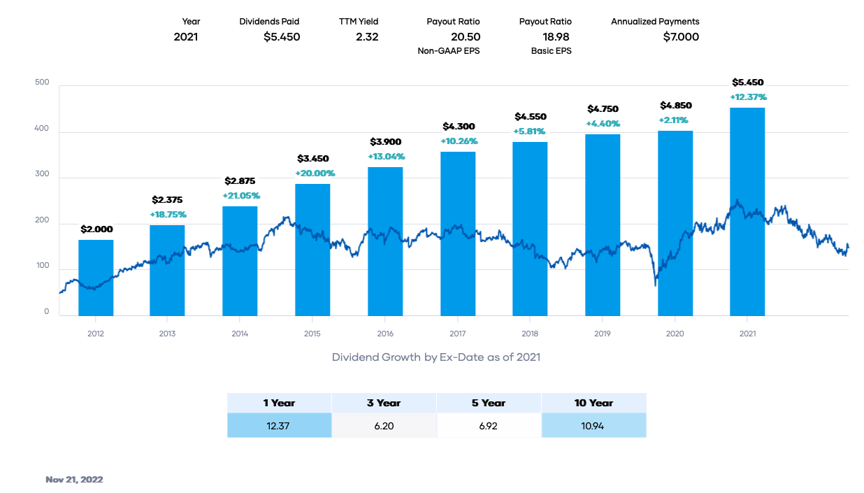 Dividend growth investors will like that Verizon is a Dividend Contender with 18 years of increases. The most recent dividend increase was in September 2022 to $0.6525 per share. Verizon consistently advances the dividend by about 2% annually in the past decade.