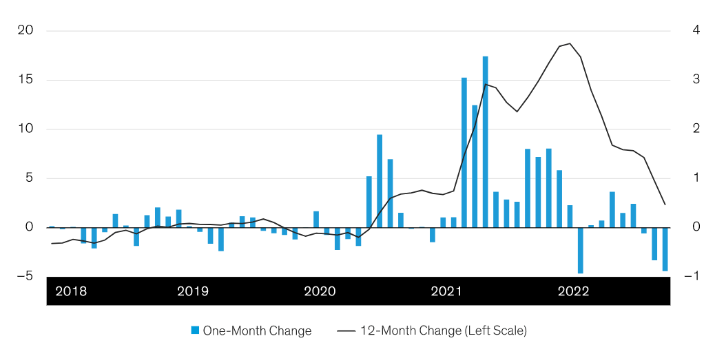 Commodity prices have also come down from their peaks—a trend we expect to continue—helping moderate goods inflation. Europe has the most scope for improvement, given that much of 2022’s inflation spike was driven by soaring natural gas prices in the wake of Russia’s invasion of Ukraine. A mild start to the winter and effective natural-gas stockpiling will likely help pull Europe’s headline inflation—currently about 10% year over year—down sharply in the months ahead.