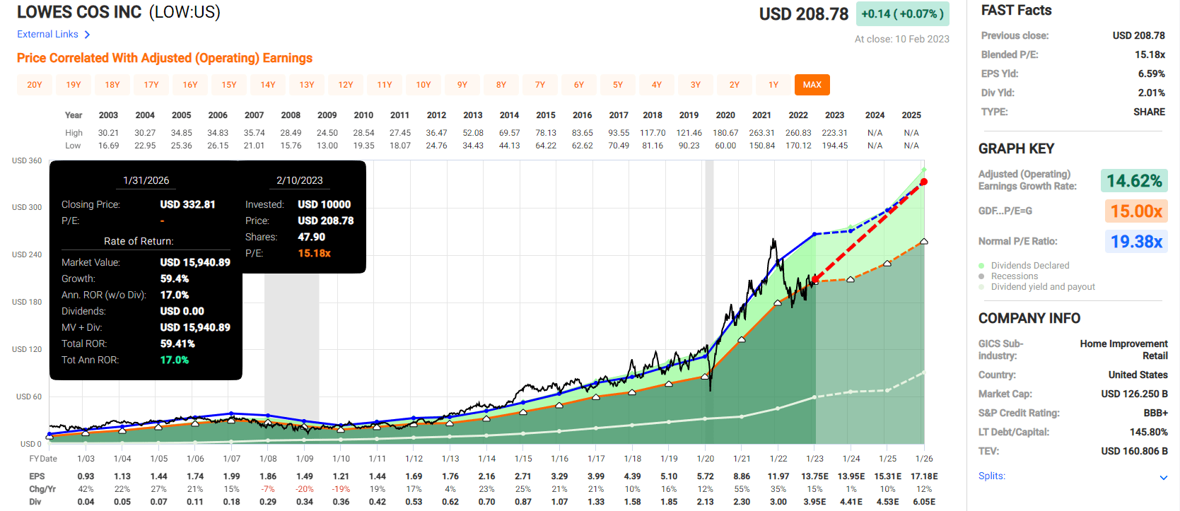 If LOW grows as expected and trades at historical market-determined fair value by the end of 2025, investors should earn 60% or 17% annually.