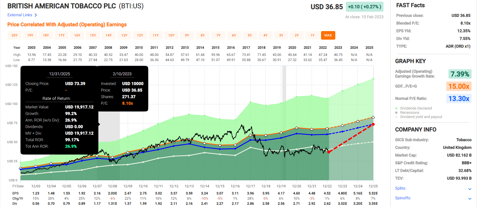If BTI grows as expected and trades at historical market-determined fair value by the end of 2025, investors should earn 100% or 27% annually.