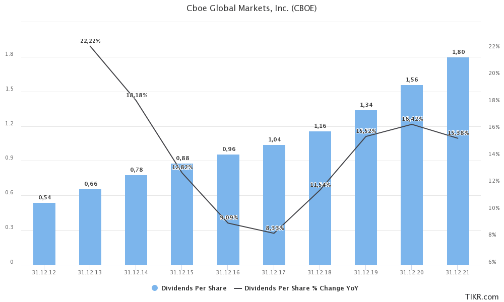 In the case of CBOE, the company pays a $1.92 annual dividend per share. This translates to a 1.7% yield based on its current price of $114.73.