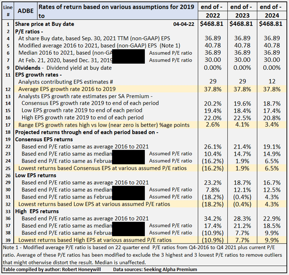 Table 1 documents historical data from 2016 to 2019, including share prices, P/E ratios, EPS and DPS, and EPS and DPS growth rates. The table also includes estimates out to 2025 for share prices, P/E ratios, EPS and DPS, and EPS and DPS growth rates (note – while estimates are shown for analysts’ EPS estimates out to 2023, 2024 and 2025 where available, estimates do tend to become less reliable, the further out the estimates go. These estimates are generally only considered sufficiently reliable if there are at least three analysts contributing estimates for the year in question). Table 1 allows modeling for target total rates of return. In the case shown above, the target set for total rate of return is 7.5% per year through the end of 2024 (see line 12), based on buying at the Apr. 4, 2022, closing share price level. As noted above, estimates become less reliable in the later years. In the case of Adobe, I have decided to input a target return based on 2024 year, which has EPS estimates from twelve analysts, because that is as far out as analysts’ estimates extend. The table shows to achieve the 7.5% return, the required average yearly share price growth rate from Apr. 4, 2022, through Dec. 31, 2024, is 7.5% (line 50). Adobe does not currently pay a dividend, so the return on share price is also the total return. Table 2 below summarizes relevant data flowing from the assumption of a target 7.5% total return through the end of 2024.