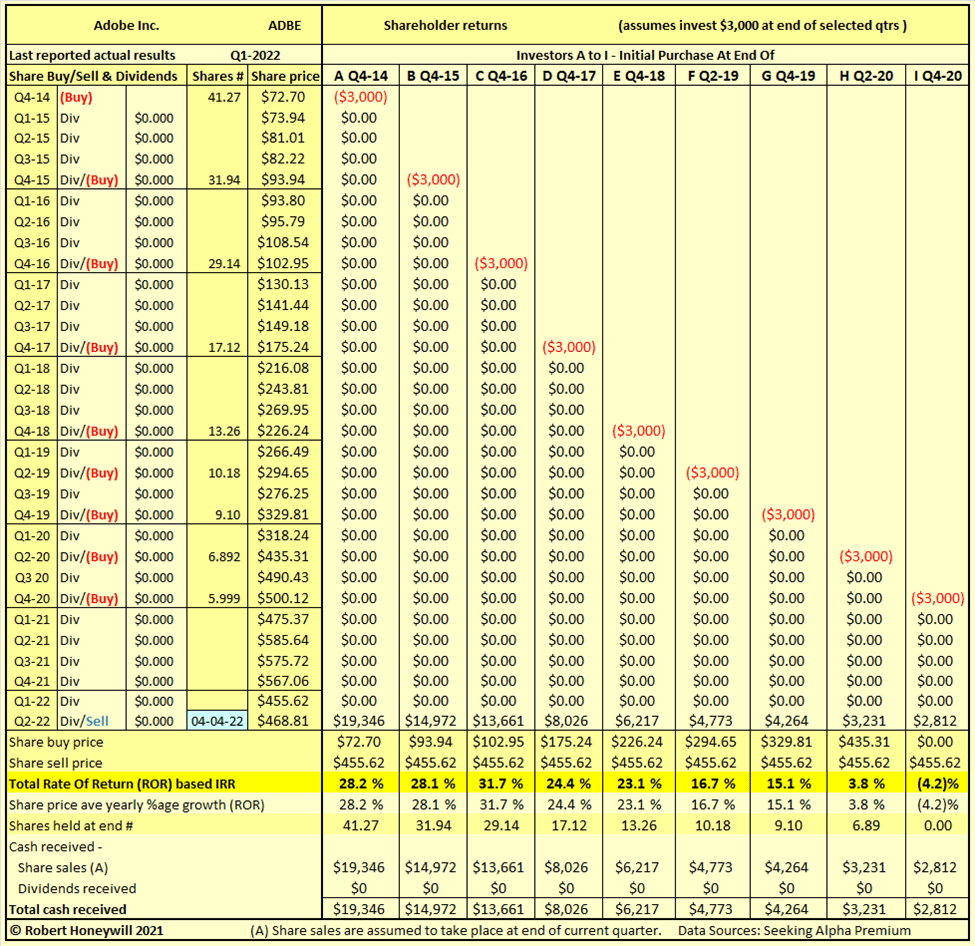 For many stocks where I create a table similar to Table 4 above, I find a wide range of returns indicating a degree of volatility and risk. Table 4 above shows anyone investing in Adobe shares at beginning of 2020 or in the six years prior have achieved outstanding returns. Seven of nine different investors, each investing $3,000 over the six years to beginning of 2020, and holding to the present, achieved returns ranging from 15.1% to 31.7%. The remaining two investors, buying shares from Q2 2020 onward had poor returns of 3.8% and negative (4.2)%. These rates of return, ranging from positive 31.7% to negative (4.2)%, are not just hypothetical results. They are very real results for anyone who purchased shares on the various dates and held through to Apr. 4, 2022. In the above examples, the assumed share sale price is the same for all investors, illustrating the impact on returns of the price at which an investor buys shares.