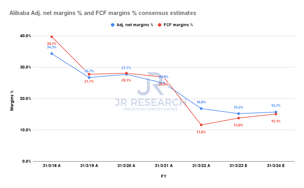 Alibaba adjusted net margins % and FCF margins % consensus estimates (S&P Cap IQ)