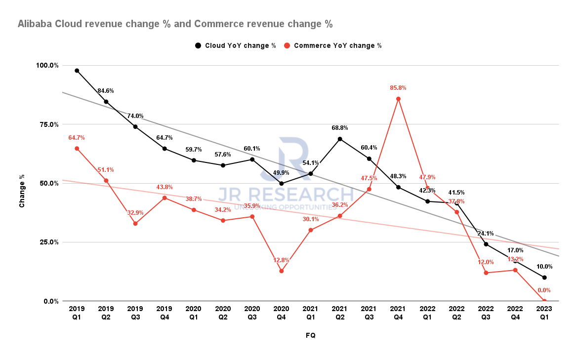 Alibaba commerce revenue change % and cloud computing revenue change % (Company filings)