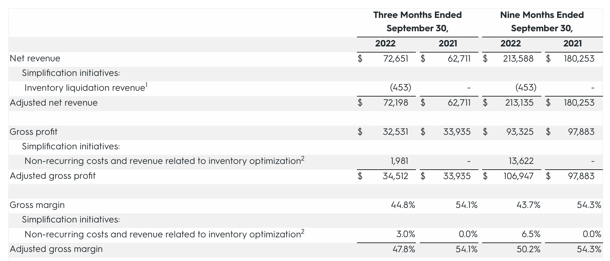 However, part of the lift in sales is also due to a step-up in promotional activity, which the company expects to ramp further in Q4. The resulting impact here, however, is that adjusted gross margins took a hit – down 630bps to 47.8% in the quarter after eliminating three points of one-time drag from inventory optimization.