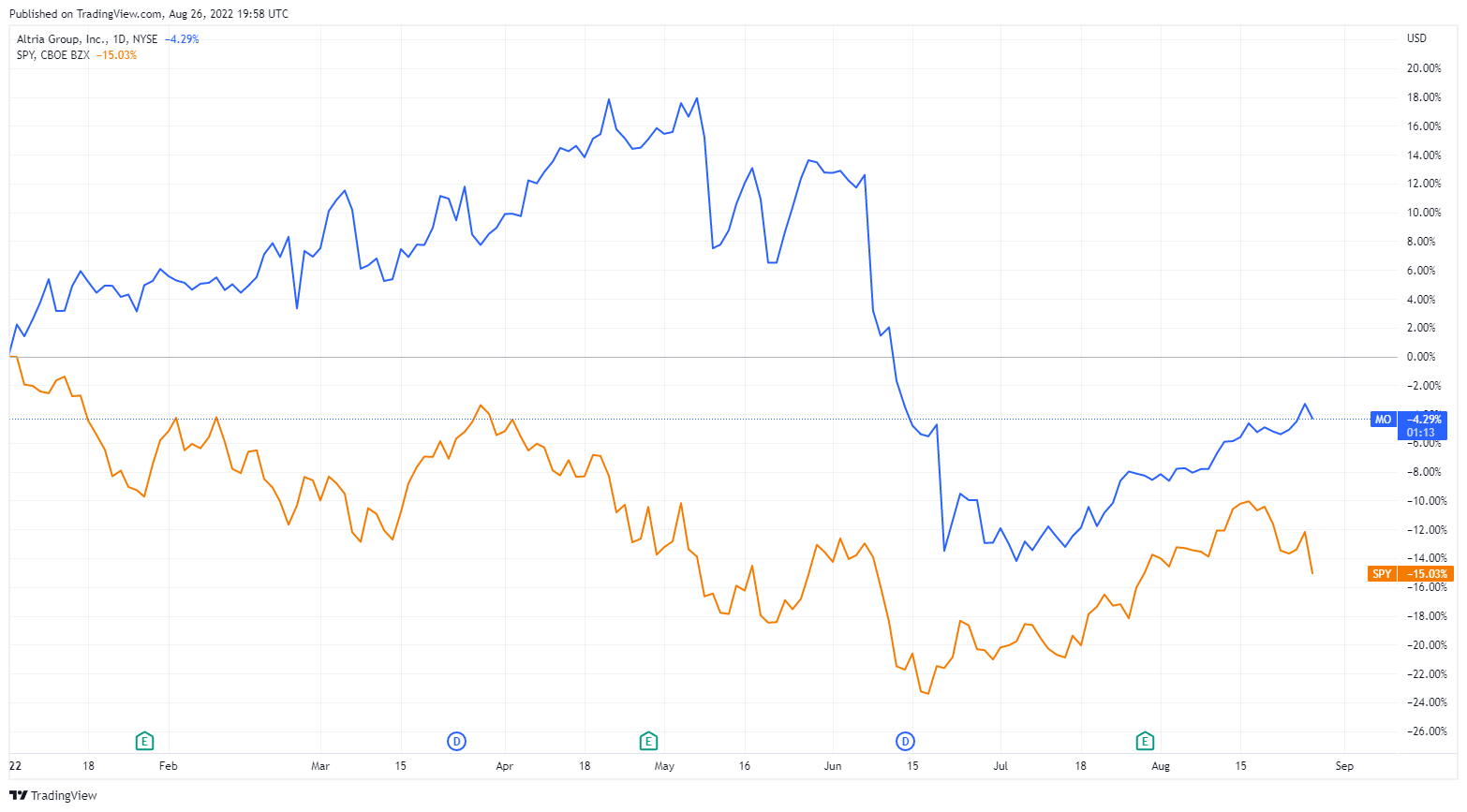If we compare the YTD return of the S&P 500 and Altria, it is easy to observe how the sin stock has vastly outperformed the S&P 500, and I am not even considering the 2 large dividends issued since the beginning of the year. For those who, like me, believe in a bearish thesis, a stock that can so well amortize a 25% loss of the S&P 500 is certainly something to consider. Should the S&P 500 lose up to 35-40% from the highs we can expect Altria to continue to play its defensive role: this is not a certainty but so far the numbers are on its side. Of course, if on the other hand the S&P 500 were to rebound to new highs we cannot expect a defensive stock like Altria to do as well; after all, its beta is only 0.64.