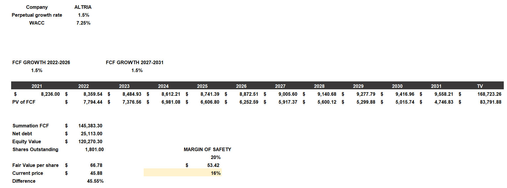 According to my assumptions, Altria’s fair value is $66 per share, much more than the current $45. Moreover, if we wanted to consider a 20% margin of safety, Altria would still be a buy. Even including a growth rate close to 0% the company would still be undervalued, yet more evidence that its current cash flows are already a reason to invest in this company, regardless of growth.