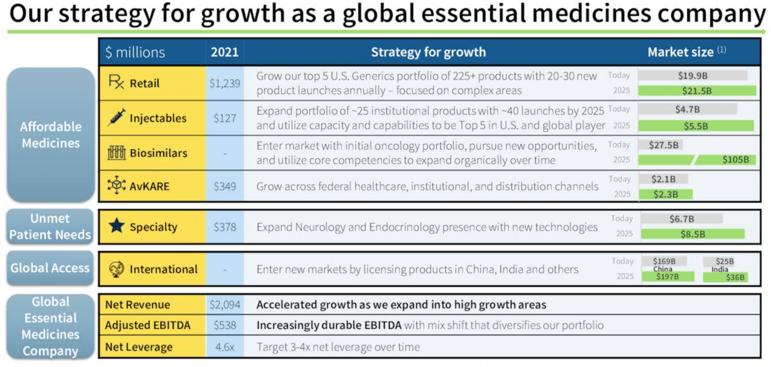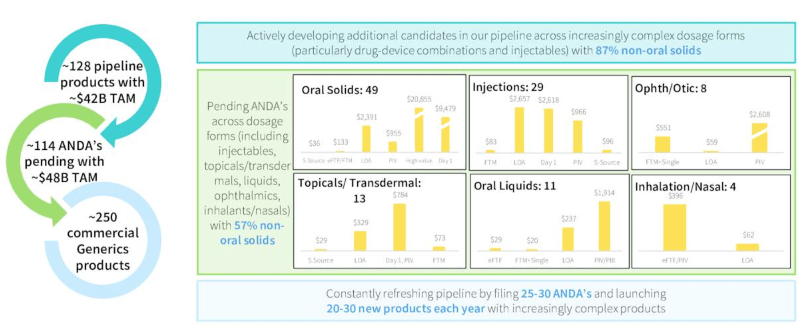 Within Generics, there are ~250 marketed products, 114 Abbreviated New Drug Applications (“ANDAs”) submitted to the FDA, with a total addressable market (“TAM”), management believes, of $48bn, and a further 128 pipeline products, with a TAM of $42bn (source: Q421 earnings presentation).