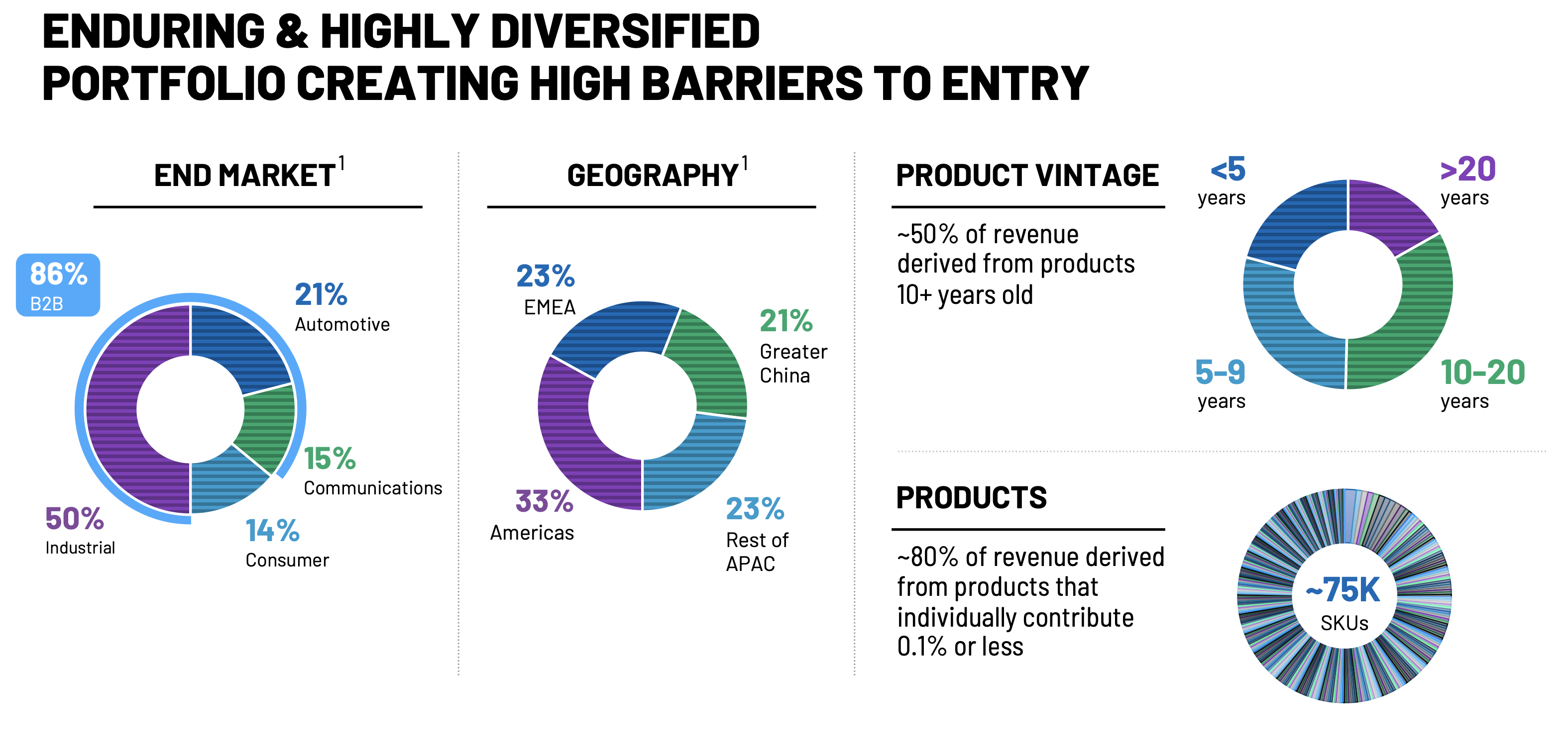 The company has reconfigured its R&D stream to tackle the most pressing problems in these areas. With a focus on innovation, the company covers a wide range of applications and has 75,000 product SKUs, which increased to 100,000 with the acquisition of Maxim. The company invests $1.5 billion in R&D annually and differentiates itself through its innovative solutions and added value to the semiconductor industry.