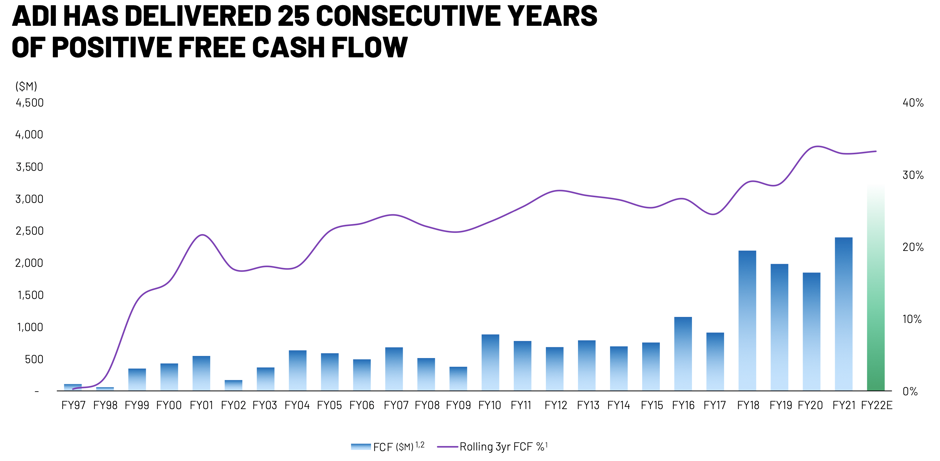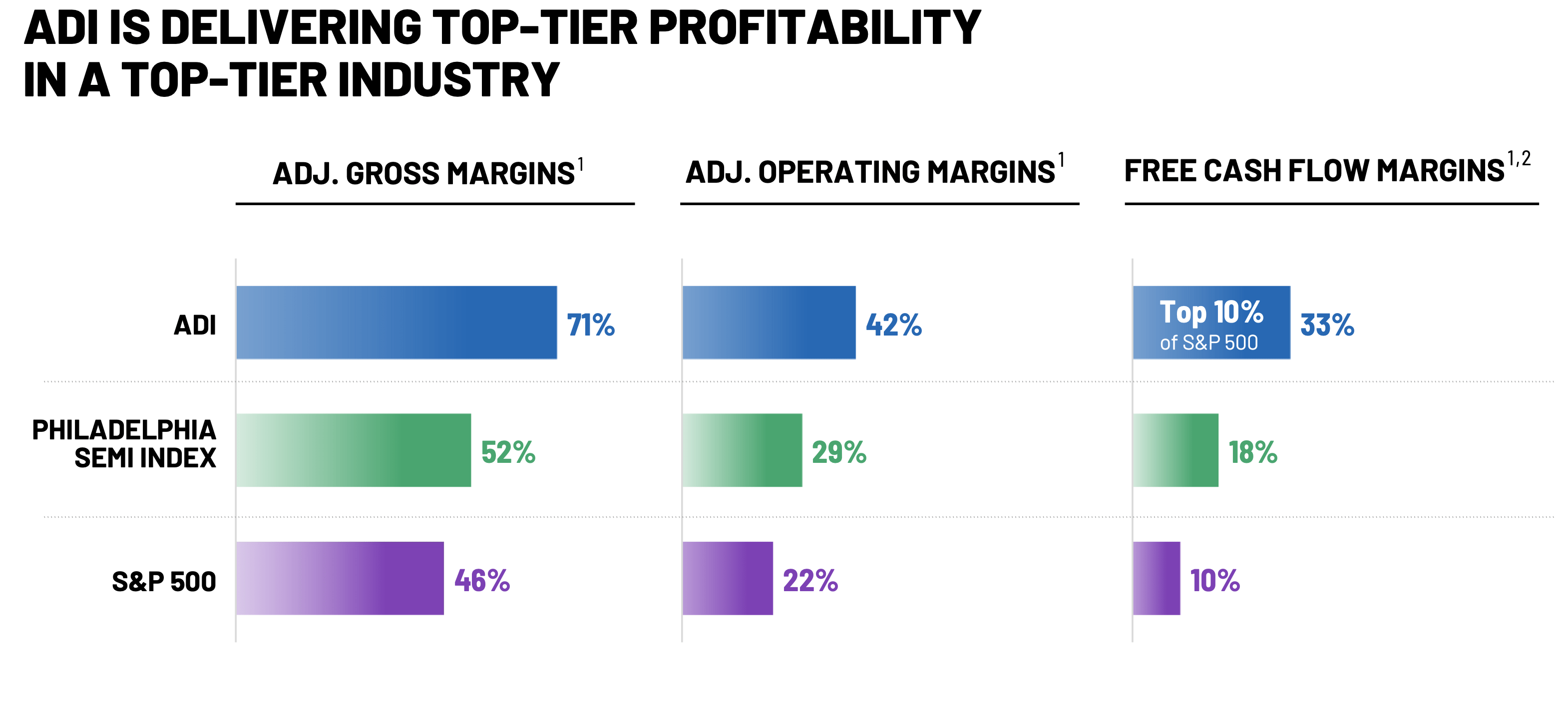 Analog Devices has a proven track record of financial stability and performance, thanks in part to its capital-efficient business model, diverse customer base and portfolio. This model, combined with the company’s significant scale advantage and its focus on the mature and comparatively slow-growing analog market, has allowed Analog Devices to consistently achieve industry-leading gross, operating, and free cash flow margins. This solid financial foundation has provided stability and dependability for investors even during market fluctuations.