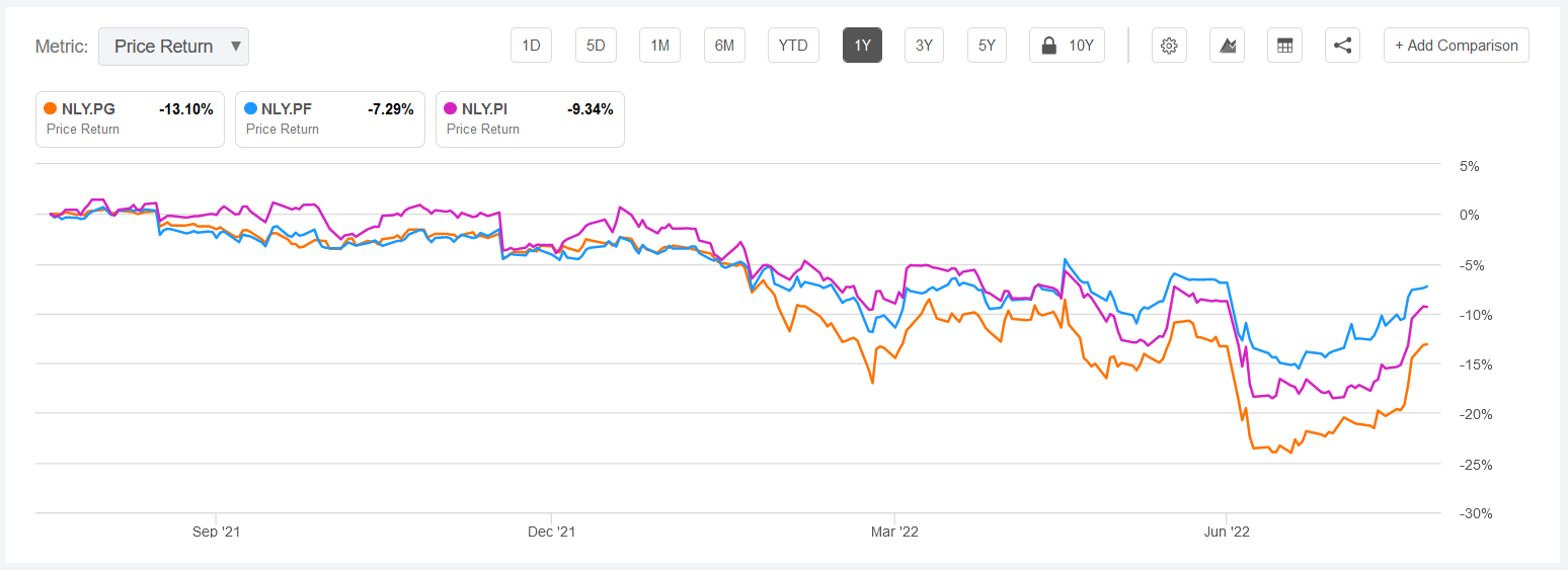 A near term catalyst exists as NLY.PF is callable 9/30/2022 and within a month of that I expect we could see an announcement redeeming those shares. If the NLY.PF shares are redeemed, I suspect that we’d see NLY.PG immediately rerate back to par value at least. If NLY.PG is redeemed within a month of its call date, the total return with three dividend payments and return to par value would be a 15.55% return.