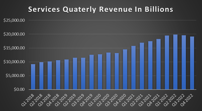 Services revenue is growing YoY but declining QoQ. In 2021, Services accounted for 18.7% of AAPL’s revenue ($68.43B / $365.82B), and in 2022 this percentage increased to 19.81% ($78.13B / $394.33B). The problem is that Services is stalling out, as we have seen the 2nd consecutive QoQ revenue decline in Q4 of 2022. Services topped out at $19.82 billion in Q2 and declined to $19.6 billion in Q3 and $19.19 billion in Q4. While there are many aspects to AAPL’s Services business segment, AAPL should focus on AAPL TV and put AMZN, NFLX, and DIS in a difficult position.