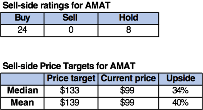 Market consensus is a buy on AMAT. Of the 32 analysts, 24 are buy-rated, and eight are hold-rated. AMAT is trading at around $99. The median price target is $133, and the mean price target is $139, with a potential 29-35% upside.