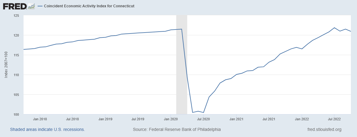 Connecticut’s coincident economic activity index is another good gauge of demand for commercial loans. The index below shows that economic activity has been faltering lately.