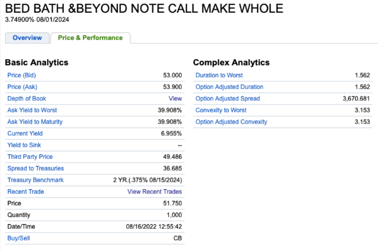 Lo and behold, as of yesterday, as a proxy for how pessimistic bond investors are towards a business transformation, BBBY’s 3.75% 8/1/2024 bonds were trading institutional sizes at $52. This is a two-year piece of paper, trading at close to fifty cents on the dollar, with a 40% year to maturity.