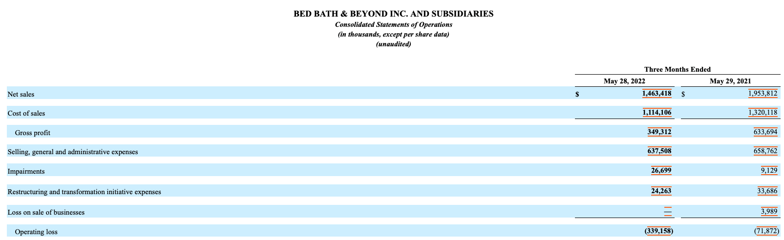 In calendar year 2022, as the economy got much more difficult with the highest inflation in 41 years, record gas prices, the lowest consumer sentiment readings ever (as of June 2022), and housing slowing considerably, BBBY operating losses spiraled, in Q1 FY 2022, the period ending May 28, 2022.