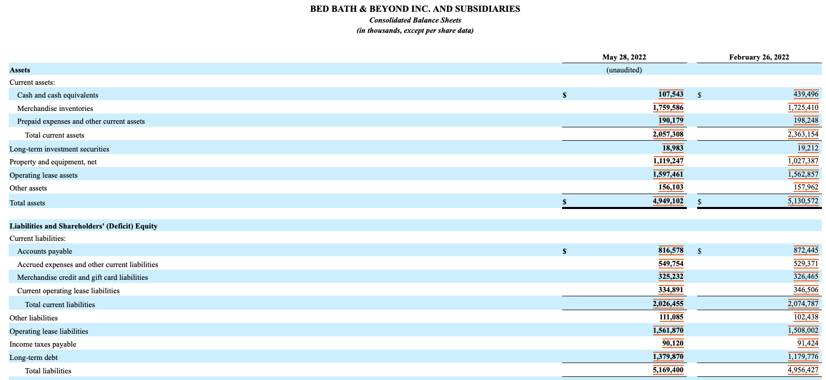 Turning to the balance sheet, as BBBY spent an inordinate amount of money on buybacks, that is also a hot mess. A once very strong balance has gone from healthy to very bad.