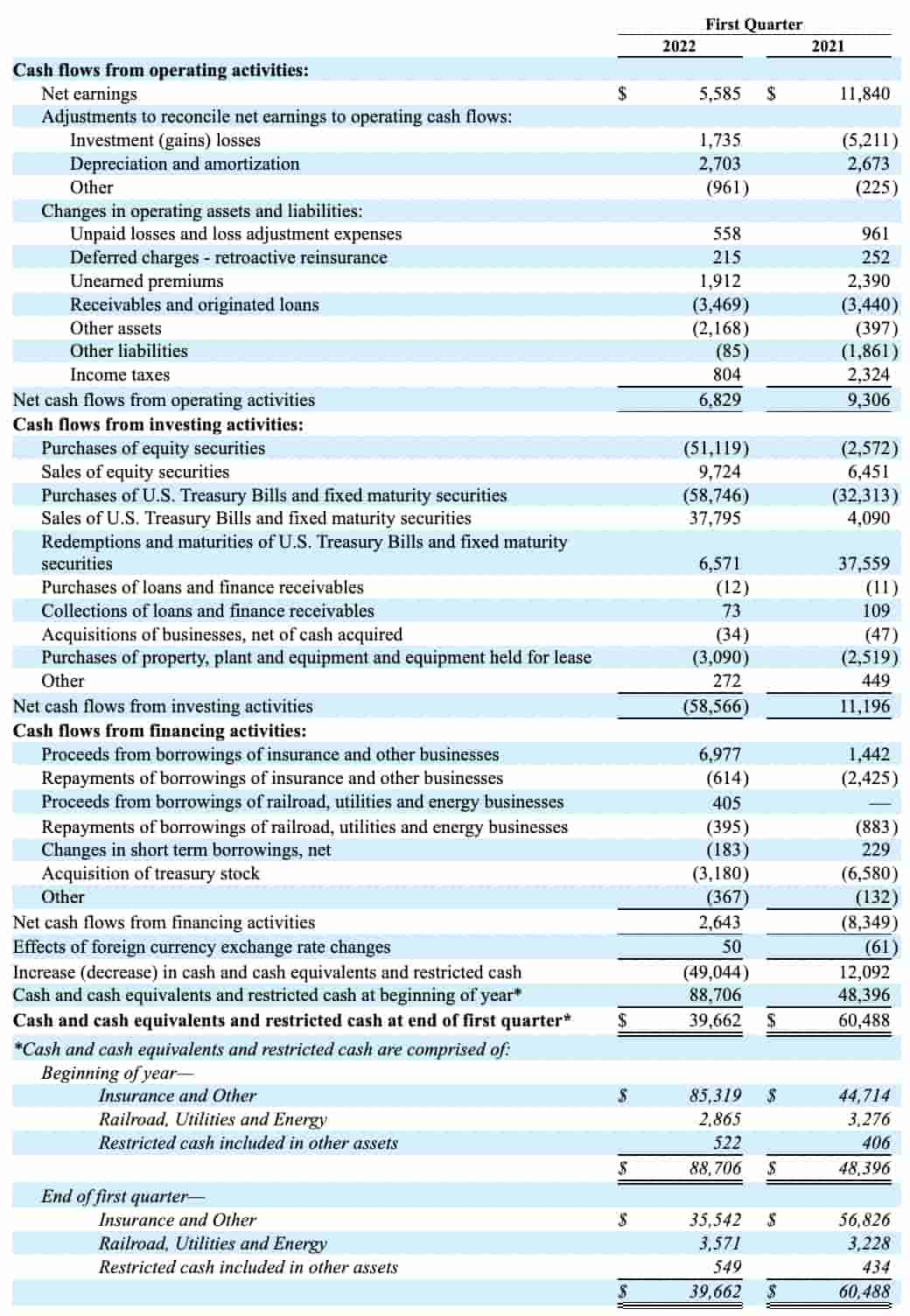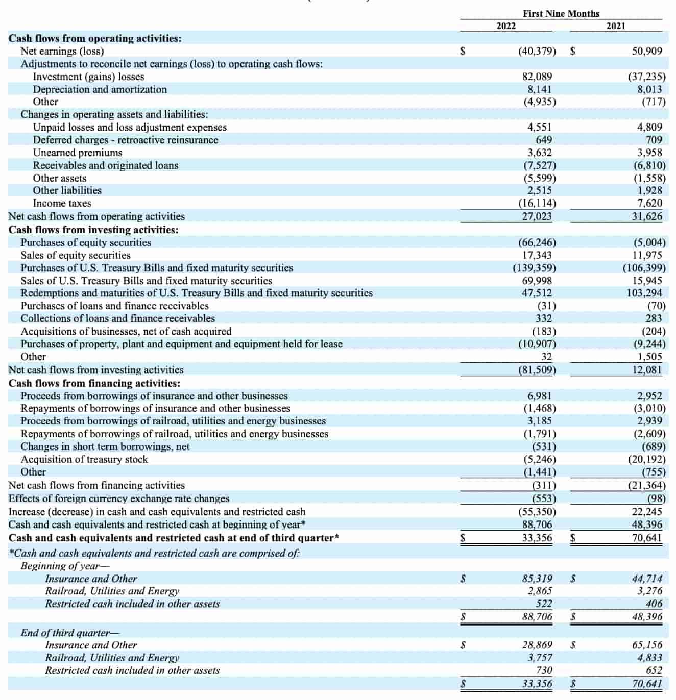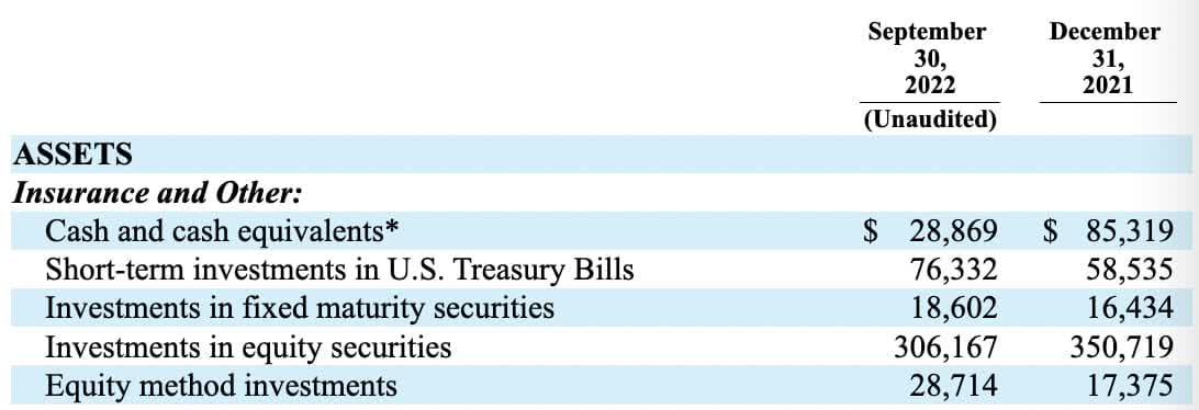 As always, the first five lines of the balance sheet are important valuation considerations. Cumulatively they fell from $528,382 million at the end of 2021 down to $458,684 million at the end of the 9M22 period. Much of the difference is due to the fact that cash and equivalents are down due to net stock purchases and the equity securities portfolio is down because 2022 has been a tough year: