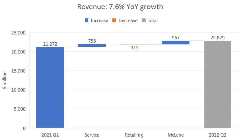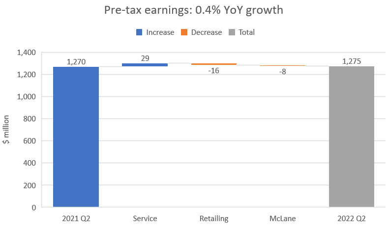 Service, Retailing and McLane had a fairly weak quarter as a whole. Topline grew 7.6% while pre-tax earnings were essentially flat with 0.4% growth YoY. The service segment was the strongest with 19.0% YoY topline growth due to (1) TTI, a distributor of electronic components, which saw strong demand and (2) aviation services due to an increase in training hours and customer flight hours. The Retailing segment was weak as a whole as topline declined 2.3%. McLane managed to grow topline 7.9% but as we’ll soon see, margins got squeezed.