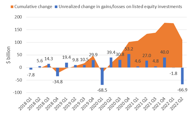 I believe all of us follow the development of the listed equity portfolio of BRK although the value of the operating businesses are not affected by these developments. The listed equity portfolio is however so large that the quarterly swings affect the value of BRK. Let’s look at how the gains/losses of the listed equity portfolio have developed since 2018 as it was in 2018 that BRK started to record unrealized gains/losses in the earnings statement instead of other comprehensive income). As we can see, the drawdown during Q2 was the second largest ever, only slightly smaller than the pandemic related drawdown. One shouldn’t pay too much attention to the quarterly swings (blue bars) but in the long-term (orange area), however, we should expect this portfolio to produce competitive returns on capital which it has done so far.