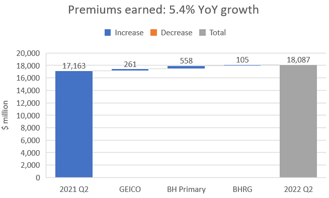 Premiums earned grew modestly at 5.4% YoY, although there were differences between the insurance businesses. GEICO weakness continued as it only grew 2.7% while BH Primary continued its stellar performance with 20.3% growth. BHRG grew only 2.3%.