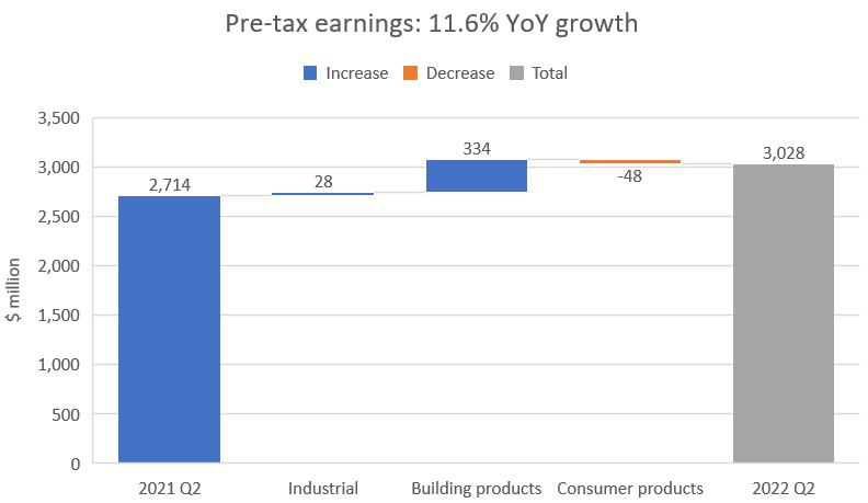 Although topline grew well across the board, expenses grew even faster for the Industrial and Consumer products segments (pre-tax earnings grew 11.6% for the whole segment). One exception was Lubritzol, part of the Industrial segment, which actually grew earnings 60.2% due to the fire in one of its facilities in the previous comparable period. However, the rest of the companies in the Industrial segment posted lower or flat earnings due to higher material and energy costs in addition to costs related to supply chain disruption. Building products was strong primarily thanks to Clayton Homes (about 44% of the segment) which benefitted from good activity in residential home construction. Management expects things to slow down due to higher interest rates on mortgages which makes sense. The other businesses in the segment also performed strongly. Consumer products earnings were also flat for the quarter due to weakness in the apparel and footwear businesses. Forest River’s leisure vehicle business actually grew earnings although it wasn’t enough to offset the weakness in the rest of the segment.
