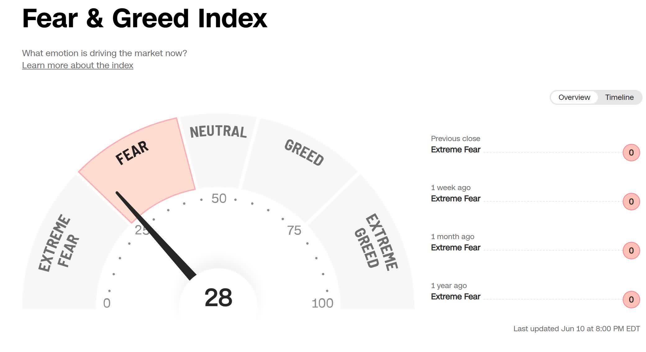 Fear in the markets is running rampant, as we’ve seen throughout the first half of 2022. The volatile market swings between fear and extreme greed have the pendulum moving, and following the most recent 40-year inflation high figures, intense fear has the markets down, ending the week with the S&P 500 -2.91%, NASDAQ -3.52%, and DOW JONES -2.73%. As of Friday and indicated in the fear & greed index below, fear is the emotion most driving market reaction.