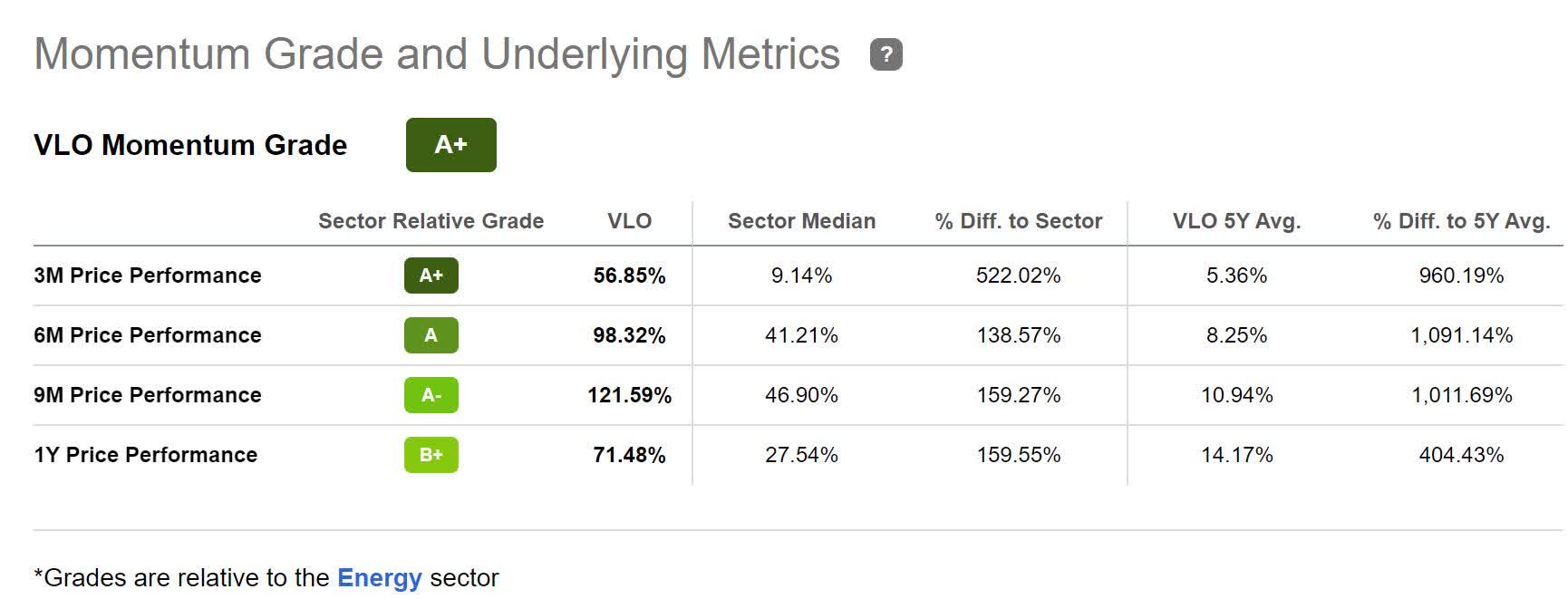 Although the stock’s valuation grade of C- is not ideal, we still consider the company fairly valued given its large Gulf Coast footprint, bullish momentum, and the strong conditions that should benefit shareholders. Year-to-date, the stock is +82%, and over the last year, it has been +71%. Valero’s quarterly share price performance is excellent, as evidenced by the A+ momentum grade.