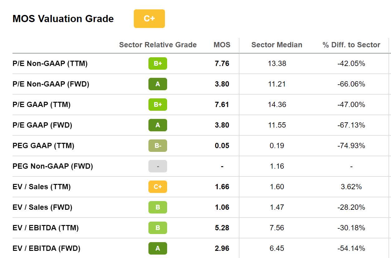 Mosaic has a C+ valuation grade when trading at a relative discount, and near the middle of its 52-week range, Mosaic has a C+ valuation grade. MOS’s forward P/E of 3.80x is at a 67% discount to its sector peers.