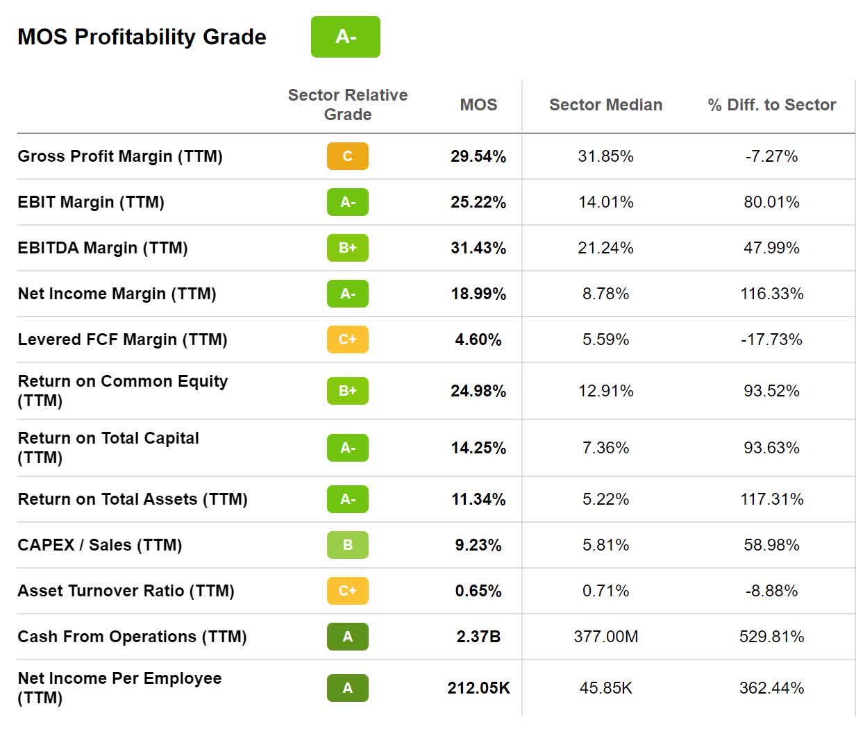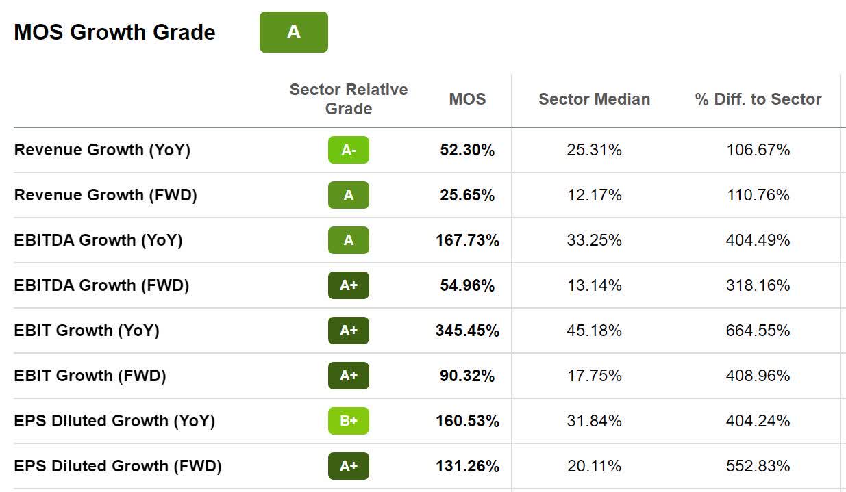 Mosaic is one of the top performers in its sector and industry and has an excellent runway and A+ momentum grade. As we look to the future of MOS, consider its incredible growth and profitability.