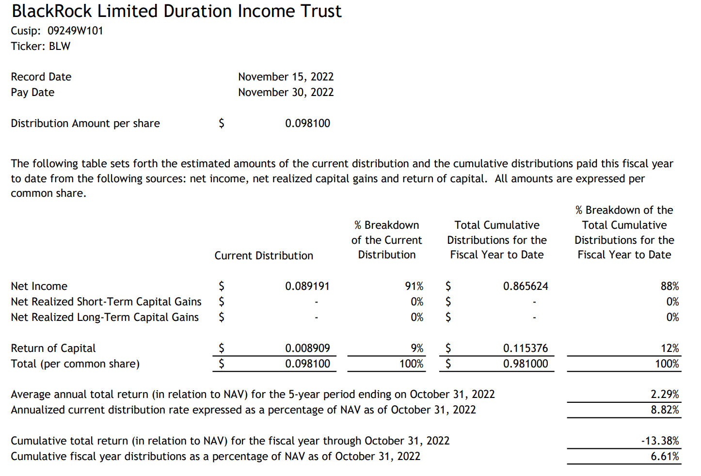 BLW’s assets with long duration and non-investment grade credits is the primary reason why performance has been poor in 2022, as long-term interest rates have increased and high yield spreads have widened.