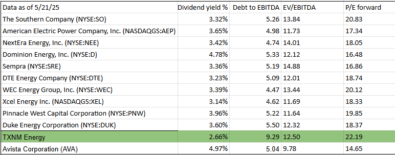 Both metrics are toward the higher end of electric utility valuation. A company like TXNM would not typically trade at the higher end of sector valuation because of its smaller size and slightly higher debt.