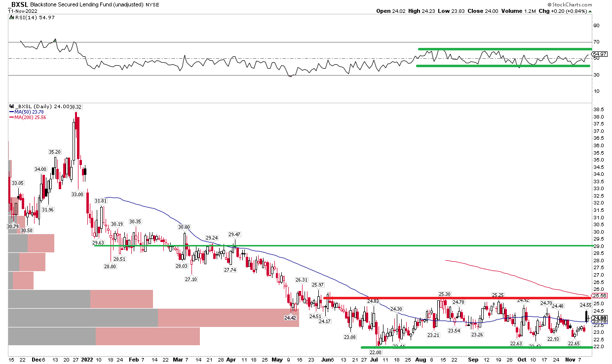 Should shares breakout above about $25.50, I see upside potential to near $29 based on a measured move price target triggered bits its $3.50 range. Also, be sure to watch for a breakout or breakdown in the RSI as a possible harbinger of future price action. Overall, I would like to see this stabilization in BXSL but would prefer a breakout to take place before getting aggressively long.
