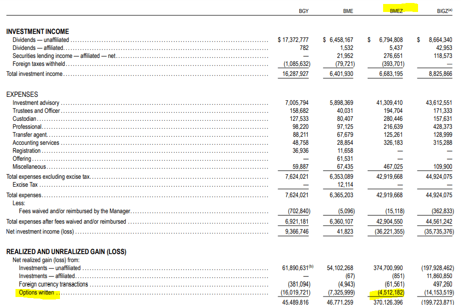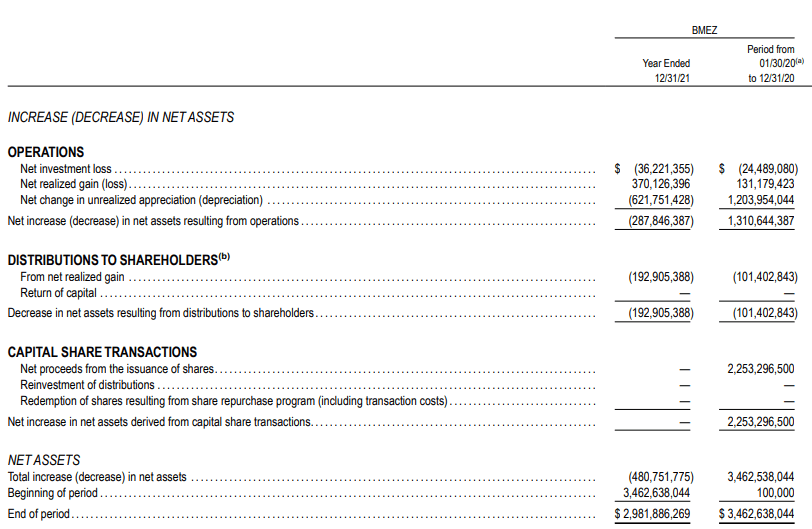 When looking at coverage for BMEZ’s distribution, it will come entirely from capital gains. The fund provides no actual net investment income. This is simply because the underlying holdings do not pay sufficient amounts of dividends or interest to offset the earnings. Total investment income came to less than $6.7 million. For a fund that ended 2021 with almost $3 billion in assets, that’s certainly not a big driver of the fund. Therefore, we see net investment losses rather than NII.